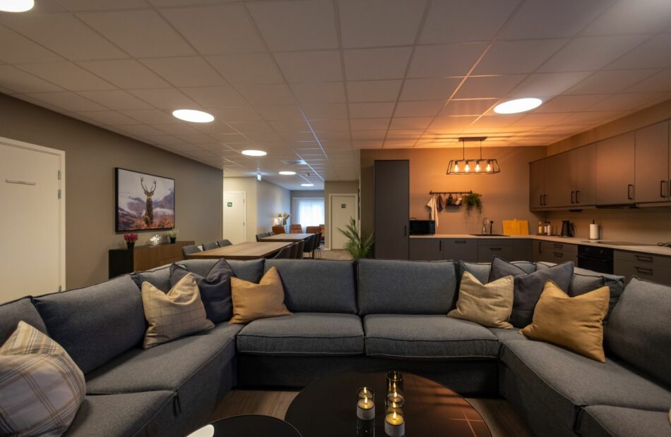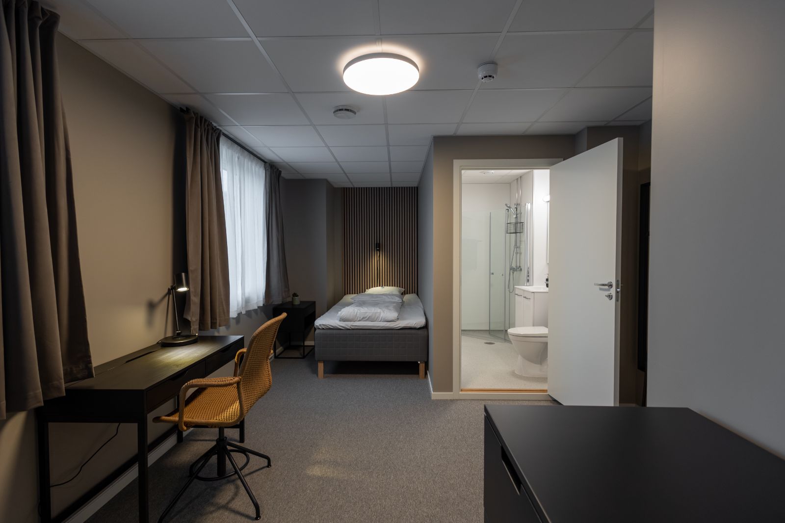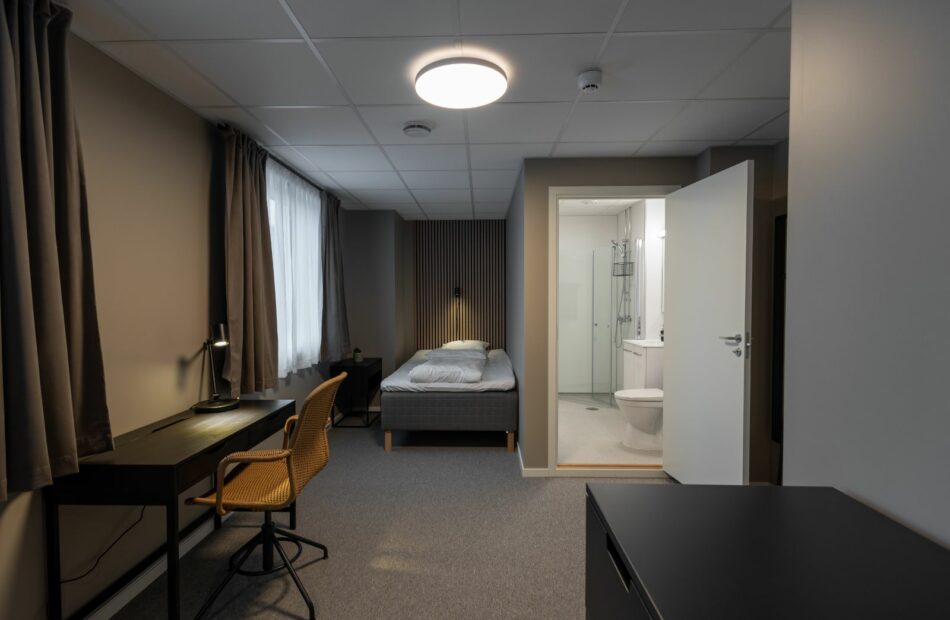 Det totalrenoverte bygget består av 14 enkeltrom og store fellesarealer som stuer og kjøkken. I tillegg er det etablert et fullverdig treningsstudio, som alle ansatte kan benytte seg av.