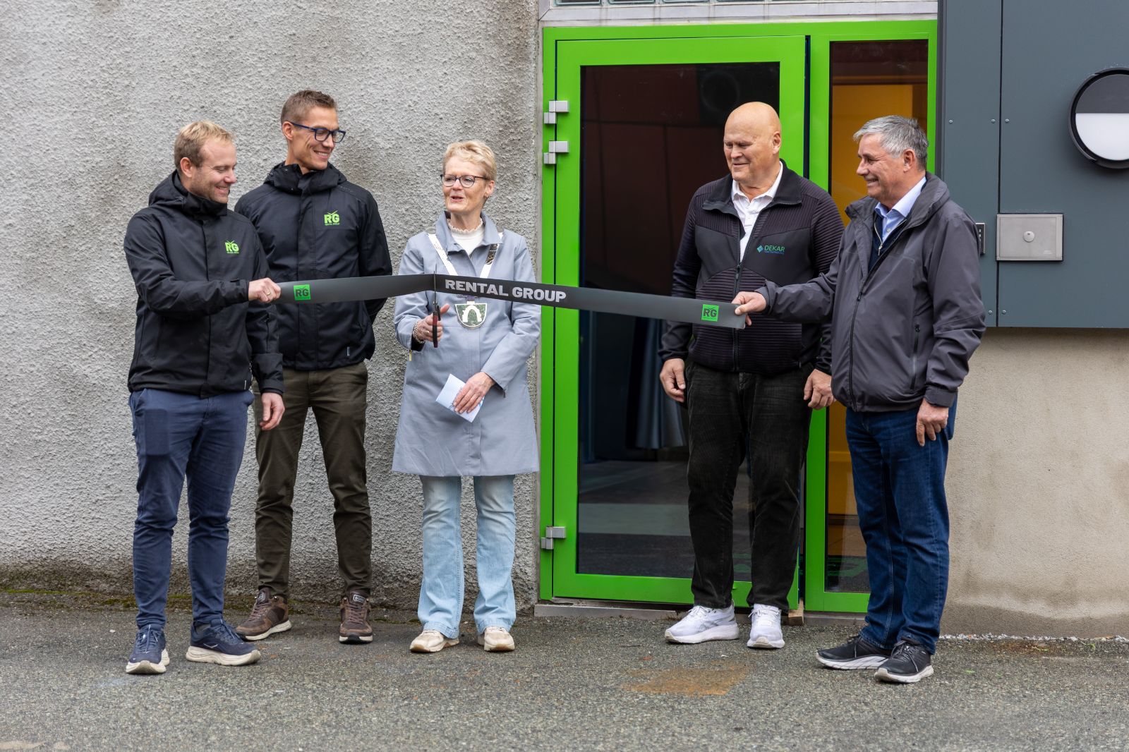 Ordfører i Modum, Sunni Grøndahl Aamodt, fikk æren av å klippe snora under åpningen av RG Home. F.v.: Leder Servicesenter Vikersund Vegard Gjellum, Servicedirektør Helge Løvenskiold, ordfører Sunni Grøndahl Aamodt, daglig leder i Dekar Tomteutvikling Albert Kr. Hæhre og styreleder i AKH Gruppen Haakon Tronrud.